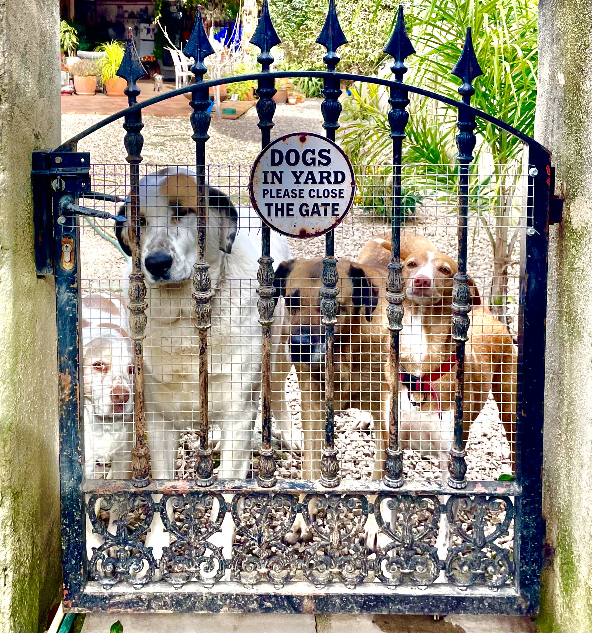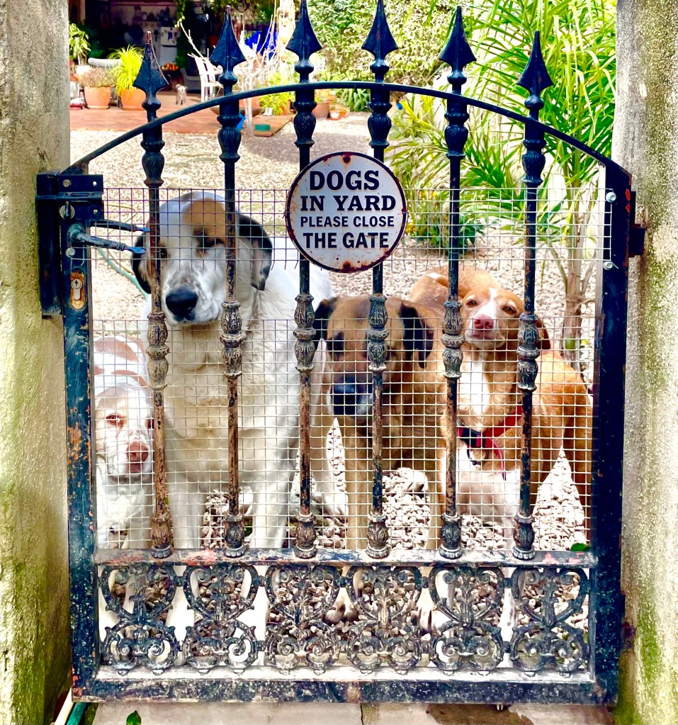 the brave ones: Pablo on the left, Bruno the biggest, Chief frightend but curious and Gigi, always a bit behind. These are the ones that bark all together very loud when a visitor is coming. They bark but don’t bite – anymore. Because each of them has it s own food bowl waiting.