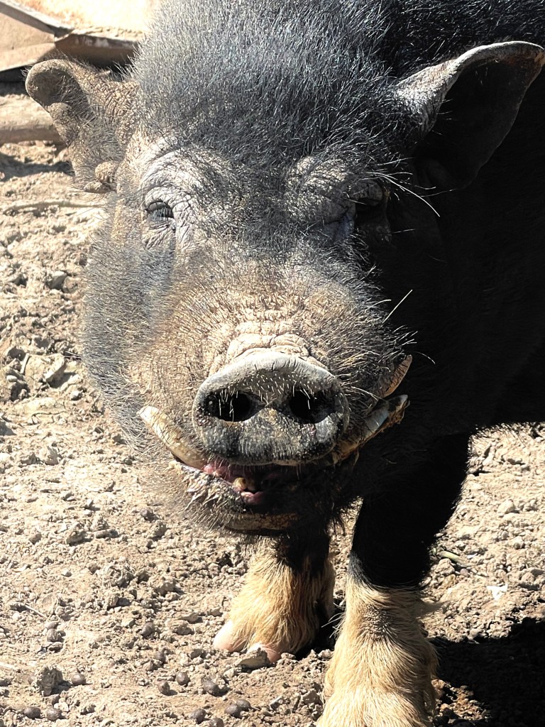Gijs is a gentle pig, who likes contact with humans. He is shy, but with a bit of patience he will come to you to be stroked. He was to be butchered and eaten in a local restaurant, but Karma sent AnimalNirvana on his path. The only thing disturbing his chill is Tom, the white bigbelly pig, who has some aggressive moods.